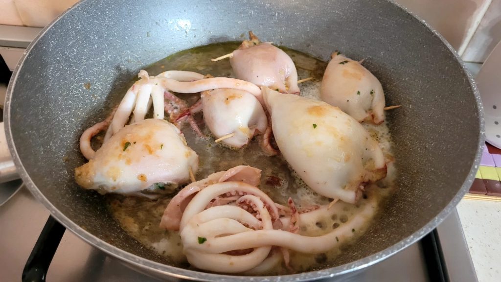 Baixe o fogo, coloque as lulas recheadas, os 2 tentáculos inteiros e deixe dourar por alguns minutos