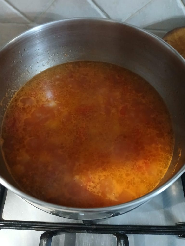 • Adicione o tomate ou o extrato, o sal e tampe. Cozinhe em fogo baixo por cerca de 20 minutos, até que as batatas fiquem macias. Durante o cozimento, verifique e mexa frequentemente. Se necessário, adicione um pouco de água. Após o tempo de cozimento das batatas, adicione cerca de um copo de água, leve à fervura e adicione o macarrão e as crostas de parmesão cortadas em pequenos cubos