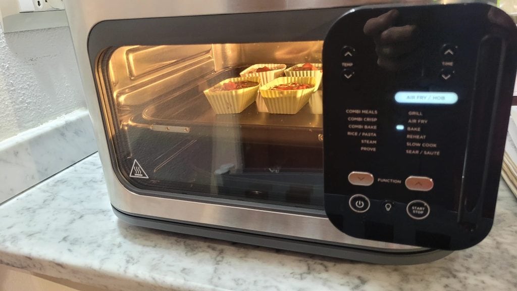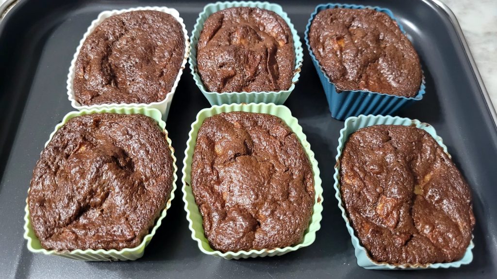 Coloque as forminhas na fritadeira a ar e cozinhe com o programa assar a 170º por 20 minutos, faça o teste do palito, se não estiverem prontos, aumente a temperatura para 180º e continue por mais 3 minutos.
