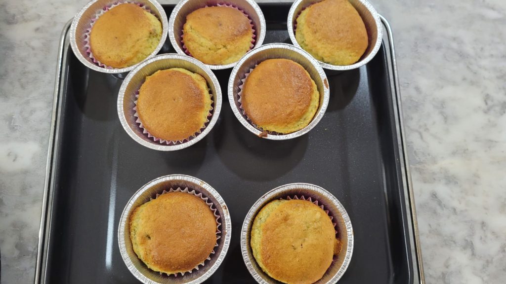 • Pré-aqueça a fritadeira por 2/3 minutos e asse a 170ºC por 18 minutos, faça sempre o teste do palito, se sair completamente seco os muffins estão prontos, caso contrário, continue por mais alguns minutos