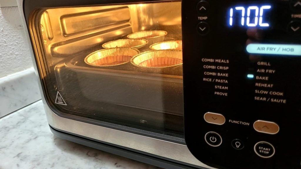 Pré-aqueça a airfryer a 170° por 3 minutos e transfira os muffins para a grade