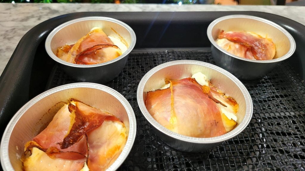 Feche o speck em formato de embrulho e posicione as forminhas na grelha da Fritadeira