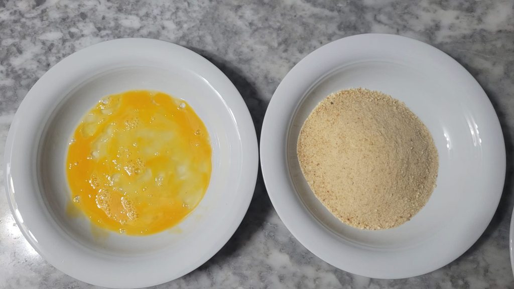 Bata os ovos em um prato fundo ou em uma tigela e prepare a farinha de rosca em outro