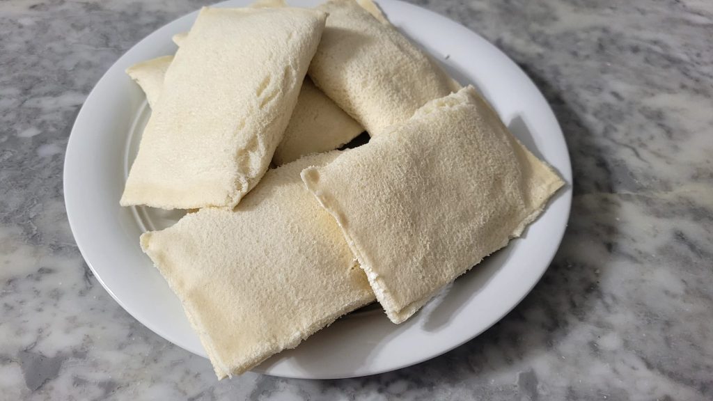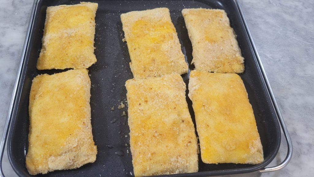 Os pacotinhos de pão na fritadeira a ar são uma ideia divertida de usar pão para sanduíches ou pão branco. O pão é achatado com um rolo, recheado ao gosto e depois passado no ovo, na farinha de rosca e depois cozido na fritadeira a ar com alguns sprays de óleo, perfeitos para os pequenos.