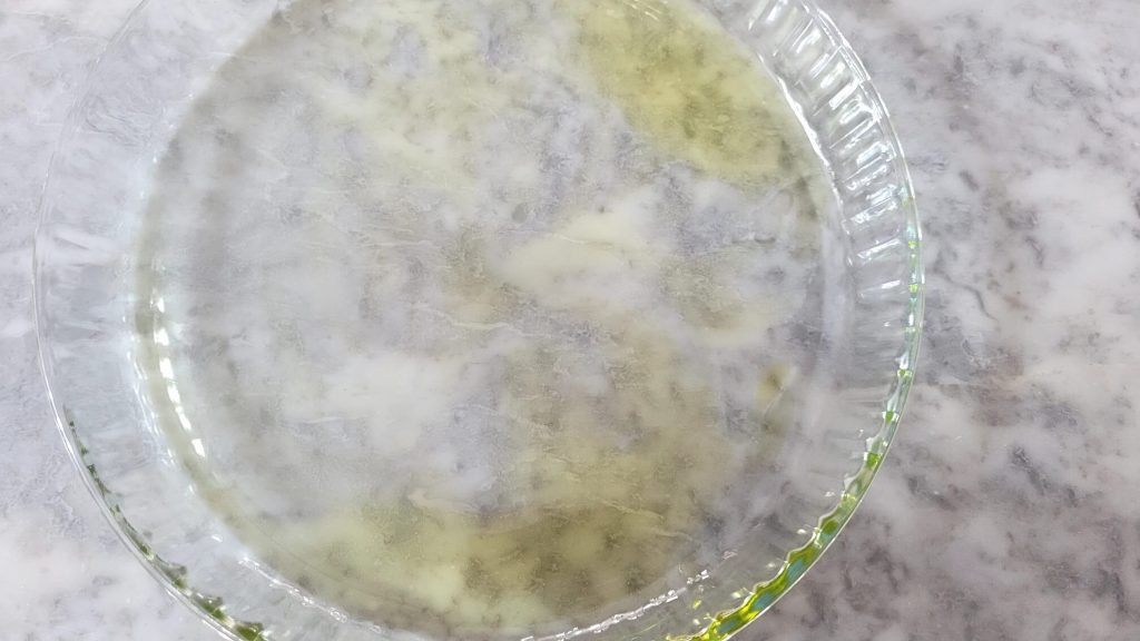 Enquanto isso, pegue uma forma e unte o fundo com azeite. Usei uma forma de 28 cm, mas você pode usar formas menores de acordo com o tamanho da sua airfryer e fazer mais camadas