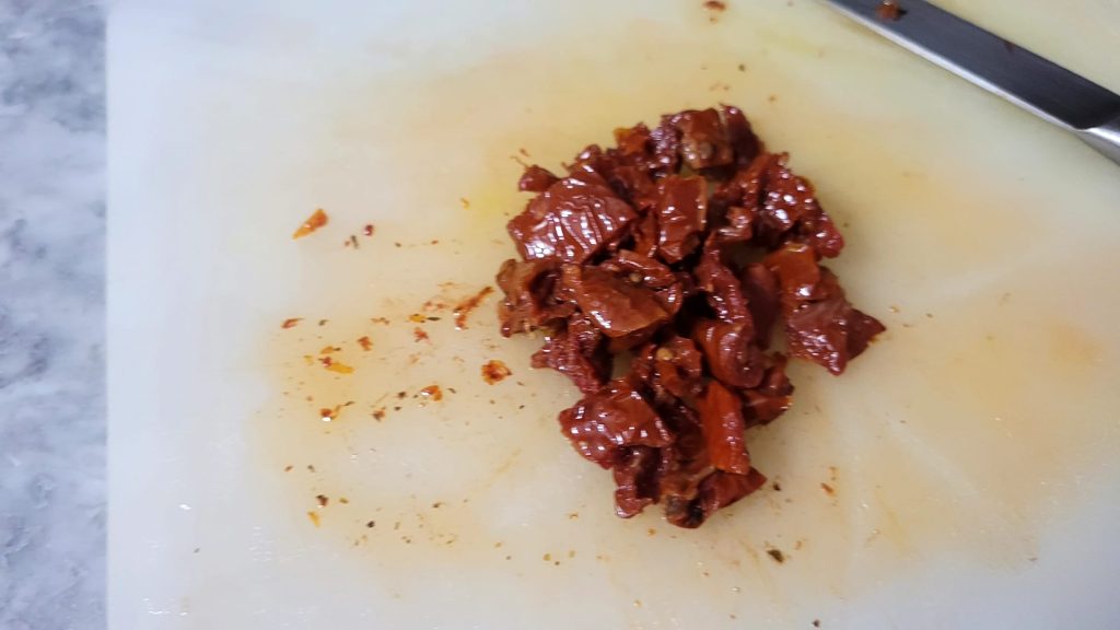Neste ponto, adicione os tomates piccadilly, os tomates secos, as azeitonas ao frango, as duas colheres de polpa ou molho de tomate, o dente de alho, o sal e a pimenta. Misture e regue com um fio de azeite.