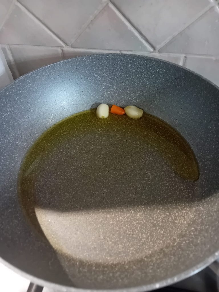 Coloque o alho e a pimenta para dourar em uma frigideira grande