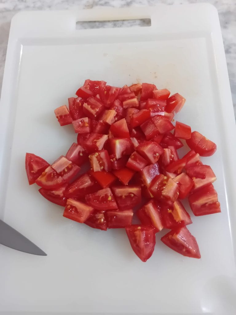Enquanto isso, corte o tomate em 4 partes