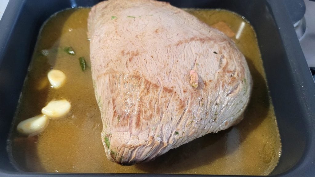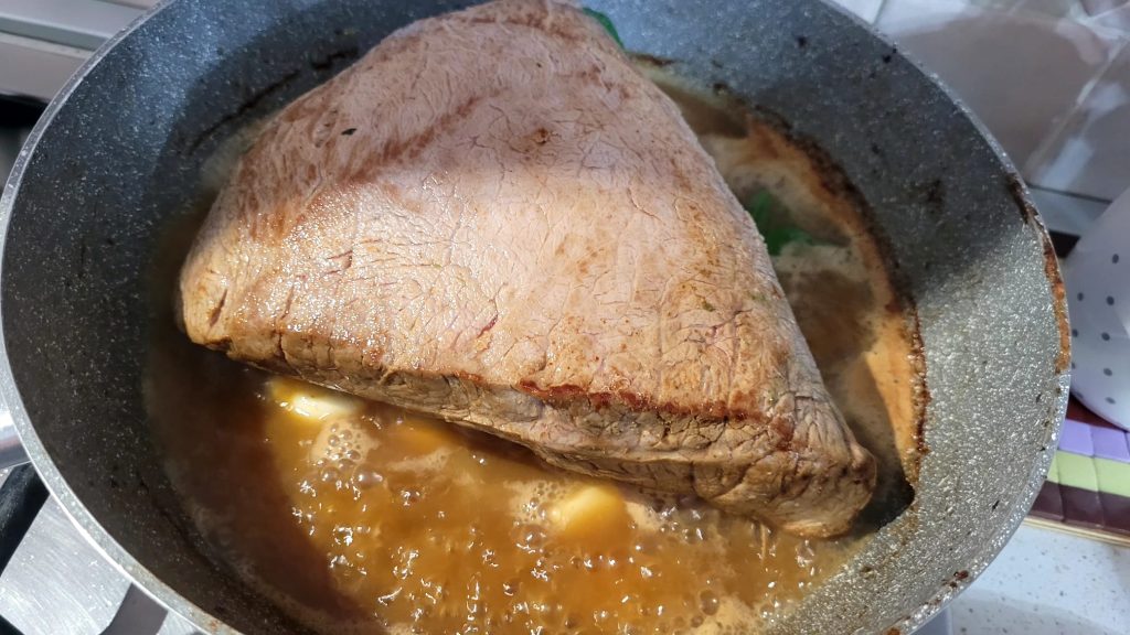 Transfira a carne para uma assadeira ou diretamente para a cesta da fritadeira, com seu molhinho adicione 1 caldo e meio copo de água