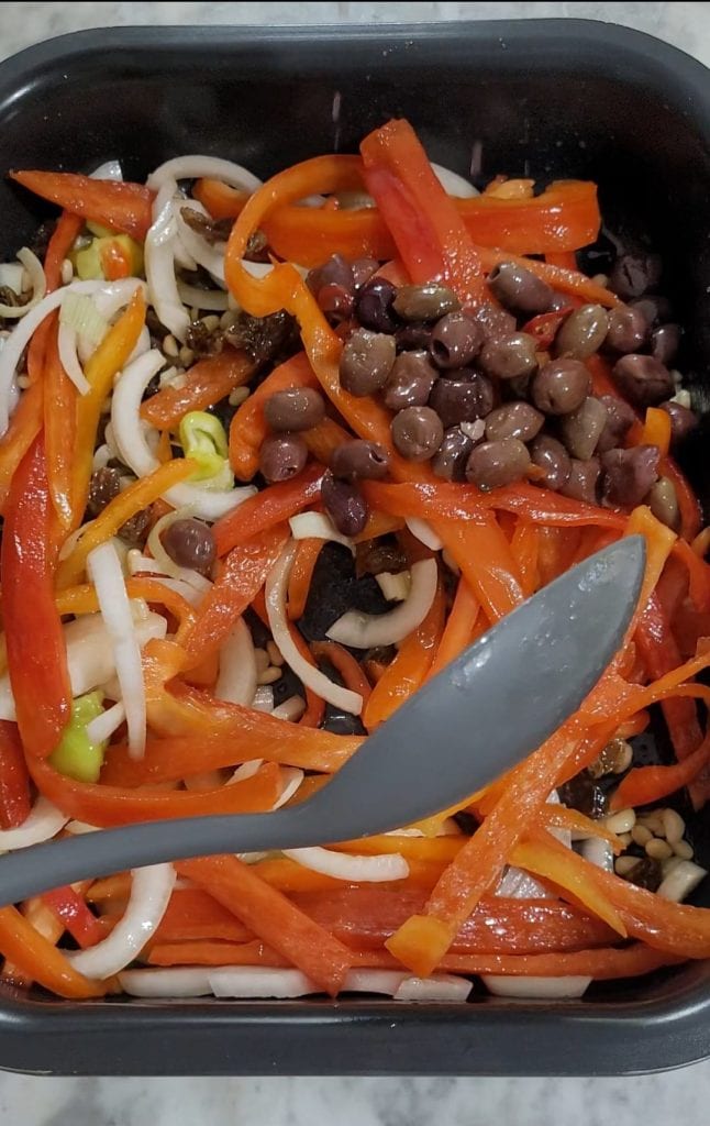 Pegue a assadeira antiaderente e junte os ingredientes, pimentão, cebolinha, pinoli, azeitonas e passas reidratadas, bem escorridas, e salgue a gosto