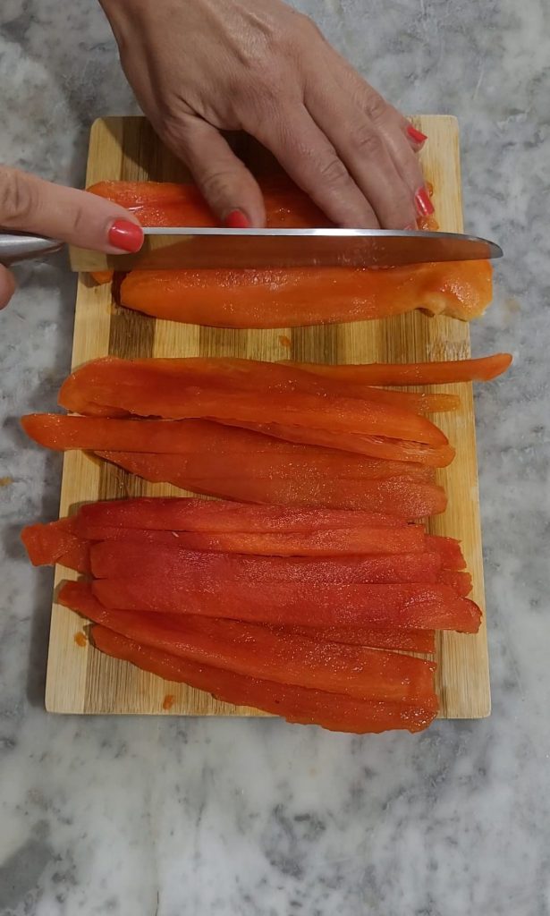 Corte-os e elimine as sementes e os filamentos internos. Corte-os em tiras