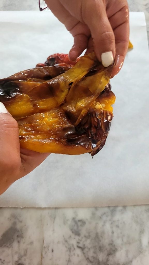 Outra vantagem é não precisar pré-aquecer a airfryer, diferente do forno que leva vários minutos para atingir a temperatura. Basta colocar os pimentões inteiros na grelha do cesto e iniciar o cozimento imediatamente, economizando tempo e energia! Além disso, o melhor de cozinhar pimentões na airfryer é a facilidade para descascá-los 😍 economiza muito tempo e esforço, pois a pele sai praticamente sozinha! Esqueça o truque dos sacos de papel e plástico, não será mais necessário! Basta deixá-los esfriar e a pele sai muito facilmente, sem ficar louco como quando são assados no forno ou microondas. Convenci você? Vamos lá, vou mostrar os poucos passos para prepará-los.