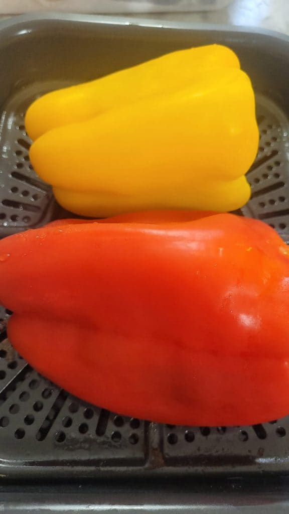 • Depois de lavar e secar bem os pimentões, coloque-os inteiros na grelha da sua airfryer