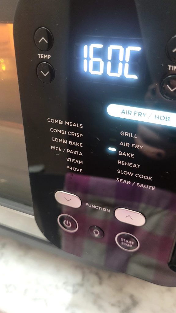 Pré-aqueça a “friggy” por 2/3 minutos e coloque a forma na grade. Asse no programa bake ou air fry por 35 minutos. Faça o teste do palito em vários pontos, não antes dos 25 minutos. Se sair seco, está assado; caso contrário, continue o cozimento