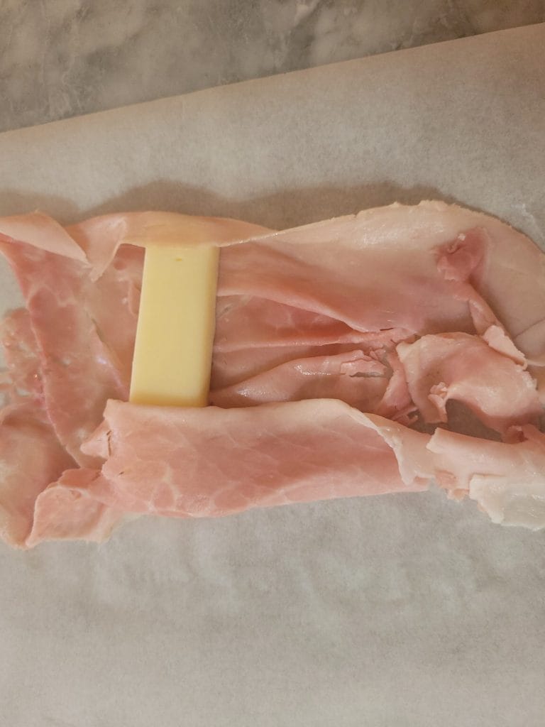 Envolver o queijo cortado em bastões na fatia de presunto, primeiro fechar os lados