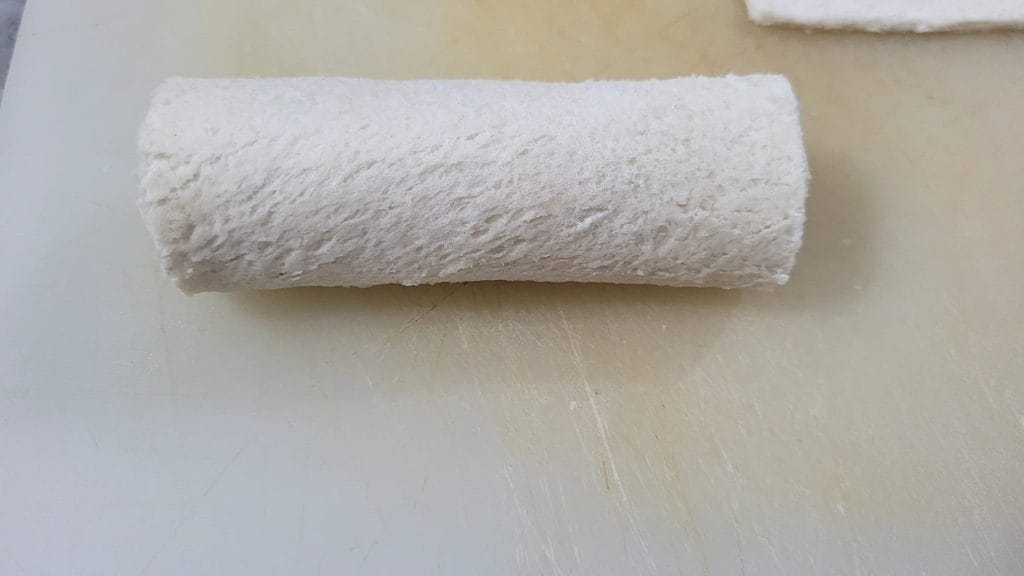 • Primeiro, em uma superfície de trabalho, achate com o rolo a fatia de pão de forma ou pão branco