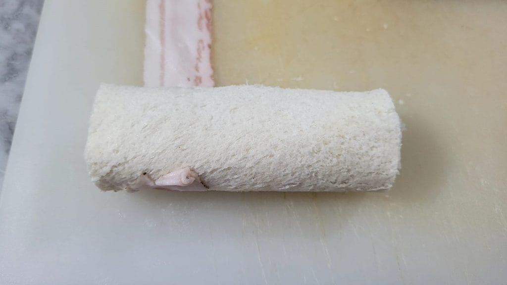 • Pegue as fatias de bacon e envolva o rolinho cobrindo-o completamente, você precisará de 2 para cada rolinho, se forem muito estreitas, até 3 para cobri-lo completamente