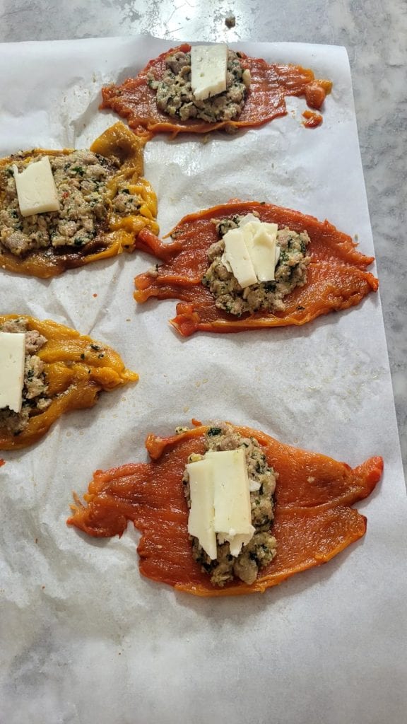 Pegue seus pimentões já cozidos, descascados e divididos, seque-os com papel absorvente, isso ajuda a manter o recheio compacto sem umedecê-lo