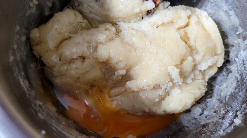 • Retire do fogo e adicione um ovo de cada vez, misture bem. Adicione o próximo somente depois que o primeiro ovo estiver completamente absorvido e bem misturado