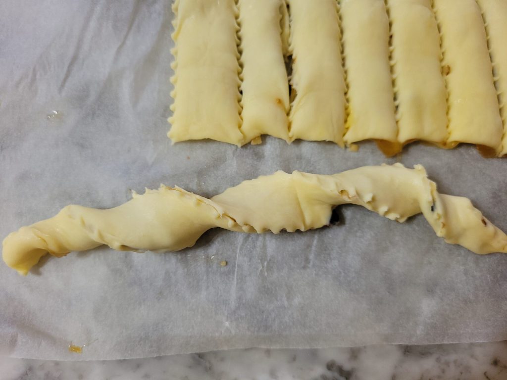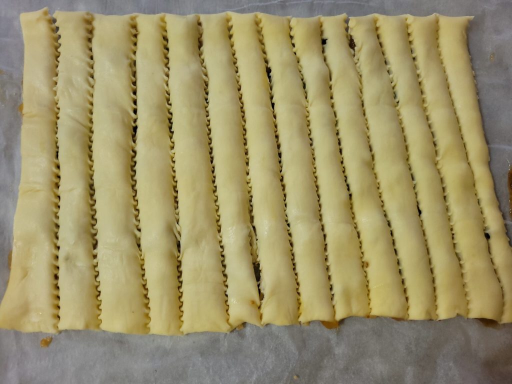 Feche com a outra metade da massa folhada e corte em tiras com um cortador dentado ou uma faca.