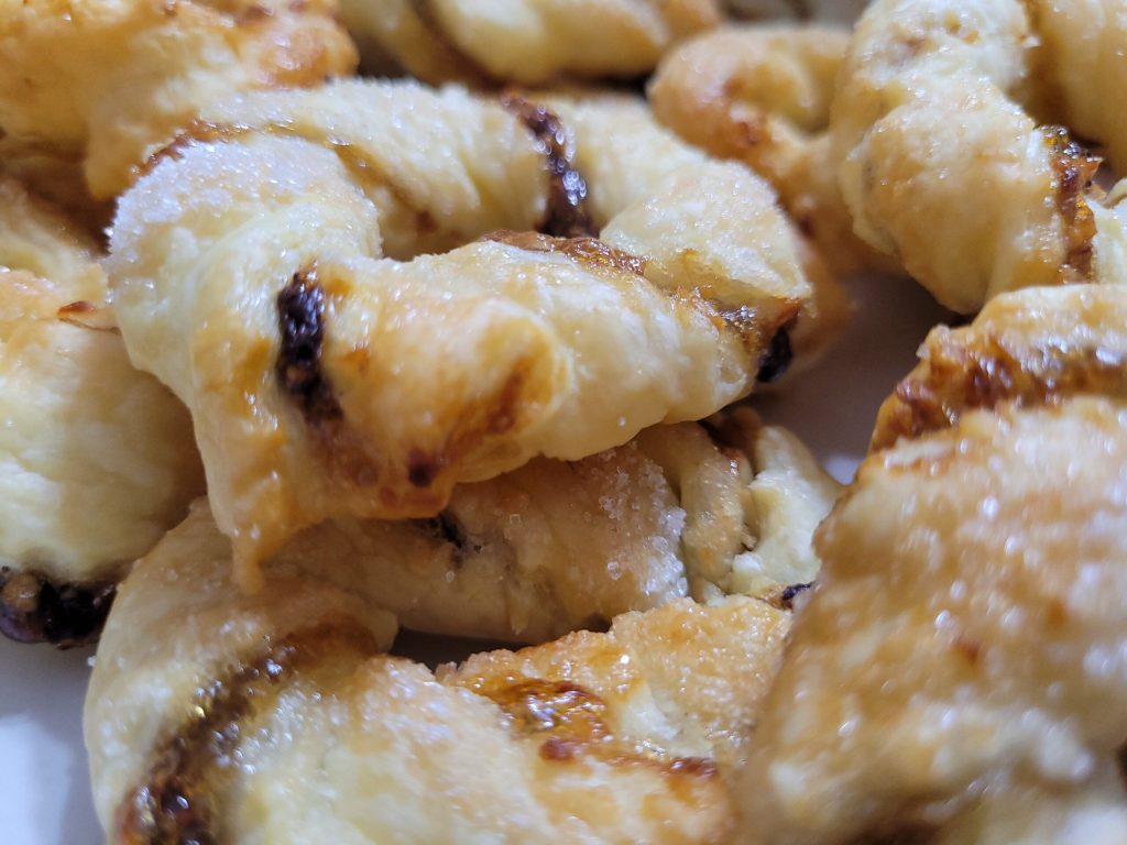 Pronto! Aqui estão suas rosquinhas de massa folhada com geleia de figo, nozes picadas e gotas de chocolate