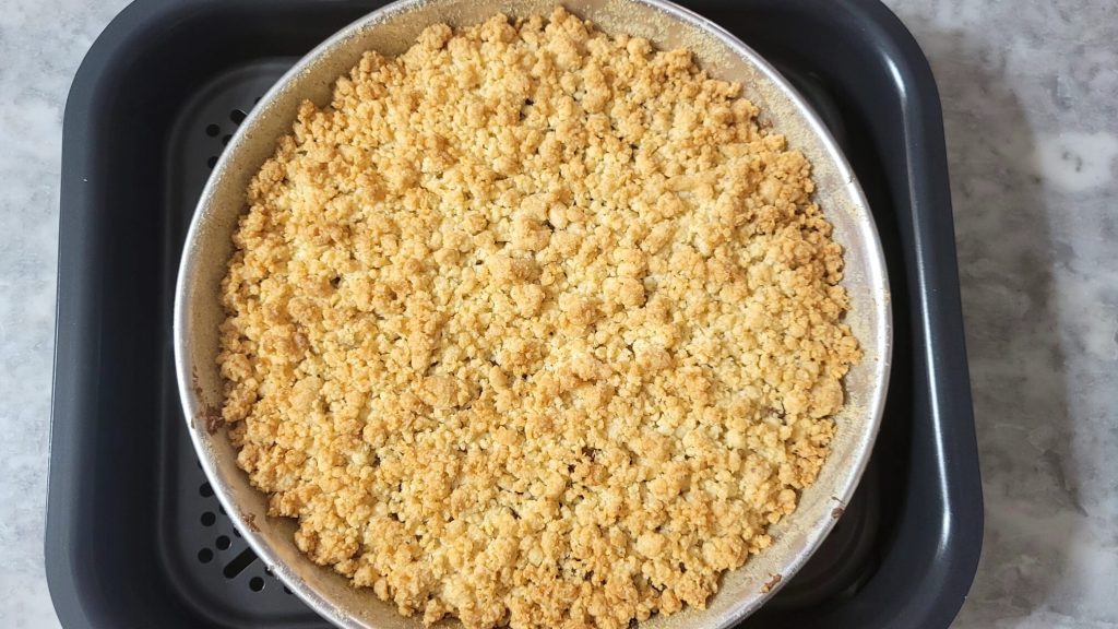Pré-aqueça a fritadeira por 3 minutos, insira a forma sobre a grelha e cozinhe a 160° por 25 minutos ou até dourar a massa