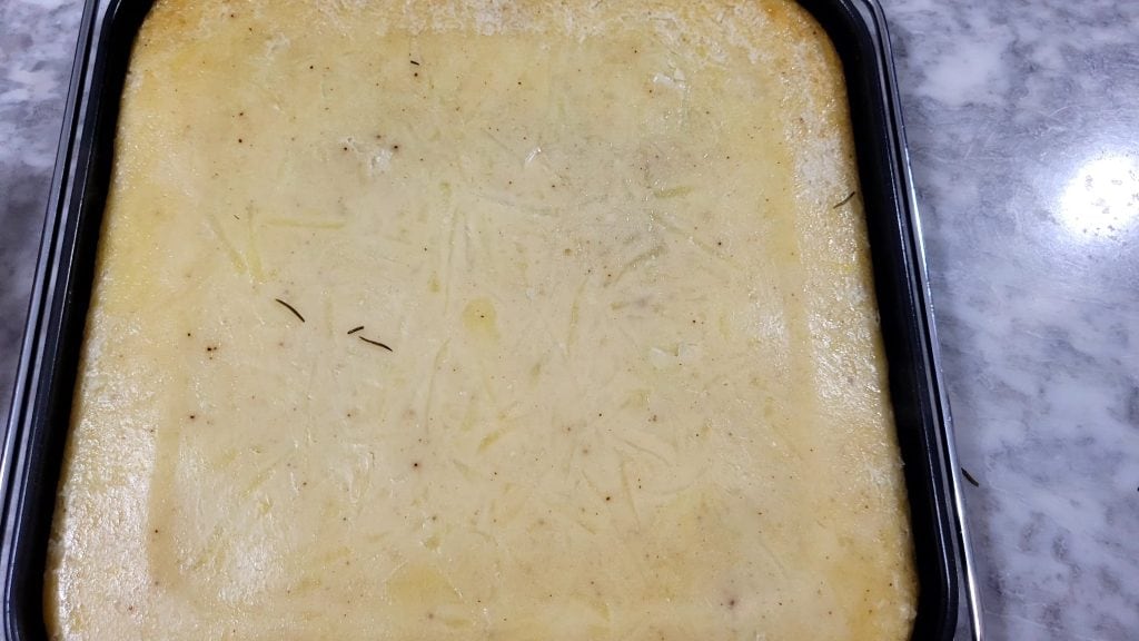 Trata-se de uma massa que inclui água, azeite de oliva extravirgem, farinha, sal, pimenta, grana padano, batatas raladas, alecrim e, se desejar, pode adicionar um pouco de pimenta vermelha, como eu fiz. Misture tudo em uma tigela e coloque imediatamente na frigideira para cozinhar. Para obter uma schiacciata de batatas bem cozida por dentro e com uma cocção homogênea e crocante em ambos os lados, a schiacciata deve ser virada no final do cozimento. Não coloquei papel manteiga na assadeira, mas se quiser facilitar essa operação, pode fazê-lo, aumentando o tempo de cocção em relação ao que indico nesta receita.