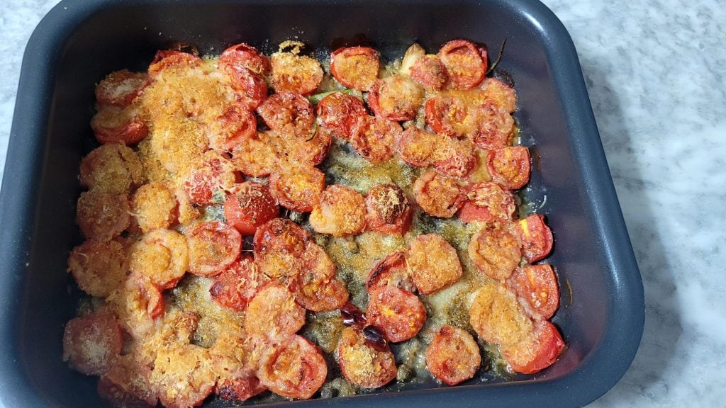 • Comece dessalgando as alcaparras colocando-as por 10 minutos em um copo de água e coloque a panela para os spaghetti no fogo. Prepare uma assadeira untando o fundo com azeite. Depois de lavar e cortar os tomates ao meio, transfira-os para a assadeira junto com as alcaparras que você dessalgou e enxaguou, os filés de anchovas em pedaços, os talos de salsinha, o dente de alho cortado ao meio e sem o miolo, sal, pimenta e a pimenta. Depois de misturar, distribua os tomates cobrindo toda a superfície da assadeira e adicione o parmesão, a farinha de rosca e um fio de azeite por cima. Cozinhe a 180° por 12 minutos