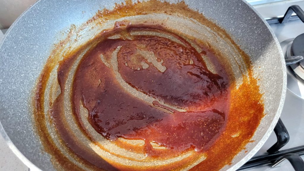 Enquanto o frango cozinha, prepare o molho agridoce, despejando na wok ou panela todos os ingredientes para o molho