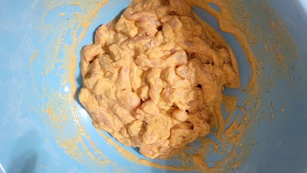 Junte numa tigela o frango, a farinha, a páprica, o alho em pó, o sal e a pimenta