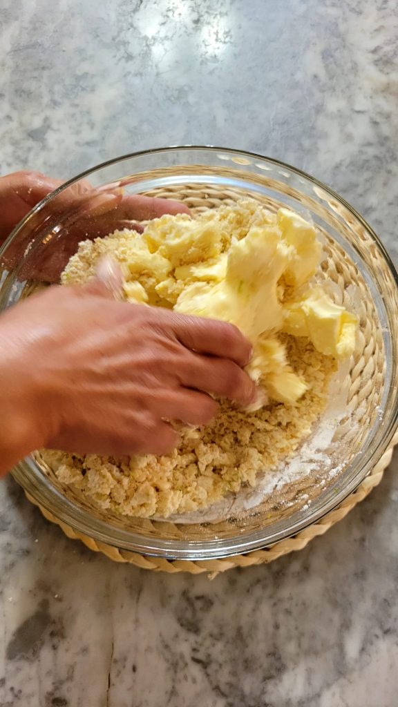 Em uma tigela, misture com as mãos, farinha, ovos, açúcar e sal, até obter uma mistura arenosa