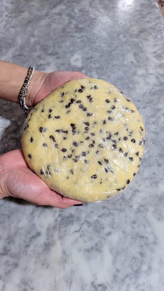 Assim que a mistura começar a se compactar, adicione as gotas de chocolate e continue misturando, sempre na tigela ou em uma superfície, até obter uma massa lisa
