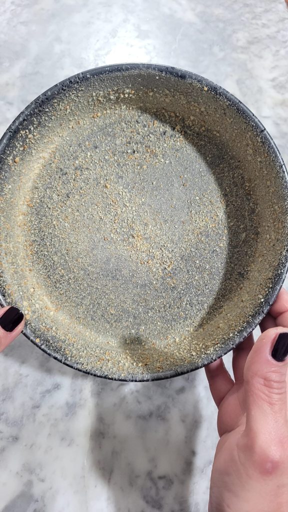 Enquanto isso, unte bem a forma e cubra com farinha de rosca, inclusive as bordas, removendo o excesso. É um ótimo truque não só para desenformar perfeitamente as sobremesas, mas para obter maior crocância na base, criando uma deliciosa douradura, além de absorver a umidade do recheio tostar bem o fundo