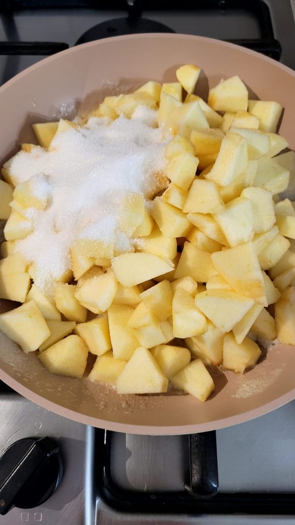 Em uma frigideira, derreta a manteiga, adicione o açúcar e as maçãs cortadas em cubos, previamente descascadas e limpas. Cozinhe em fogo médio até ficarem macias