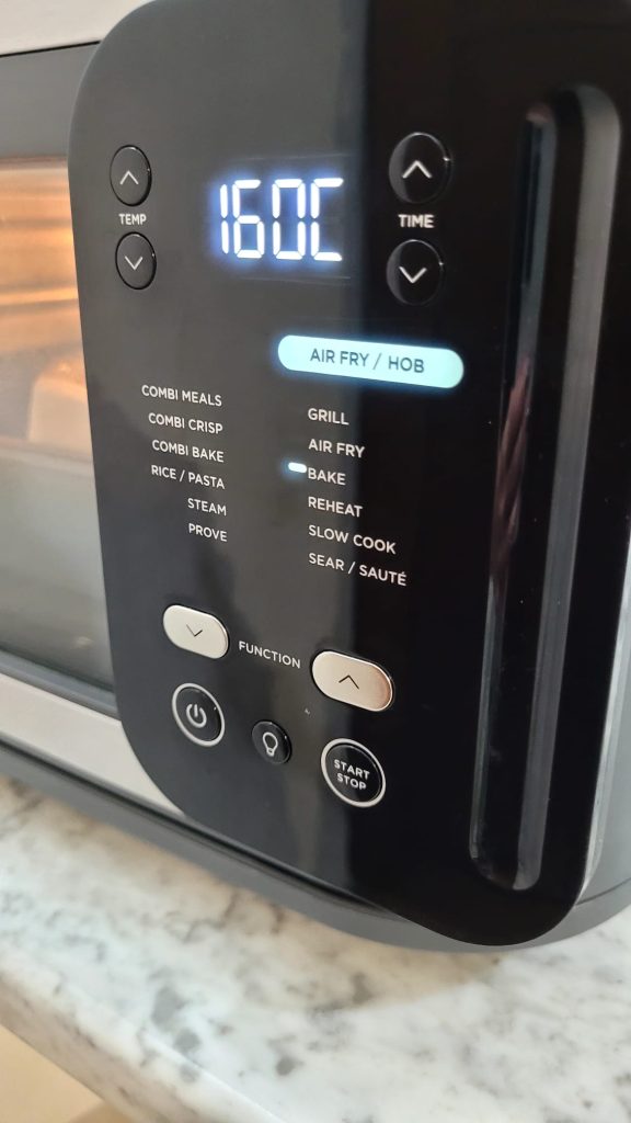 Coloque a forma na grelha e proceda com o cozimento no programa bake ou air fry a 160° por 35 minutos.