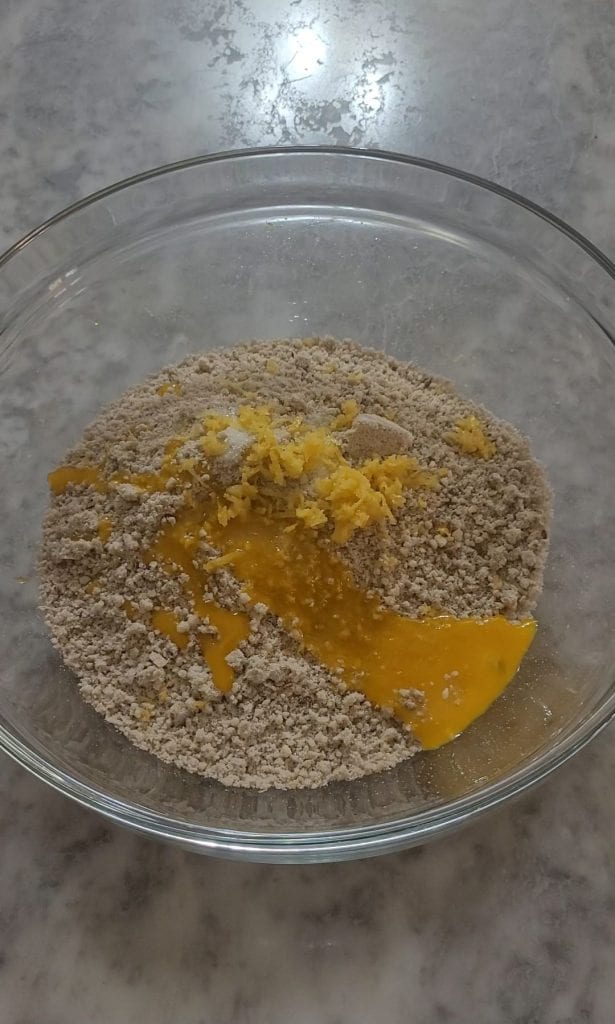 Transfira para uma superfície de trabalho ou para uma tigela, adicione a gema, o limão ralado, uma pitada de sal e trabalhe a massa à mão