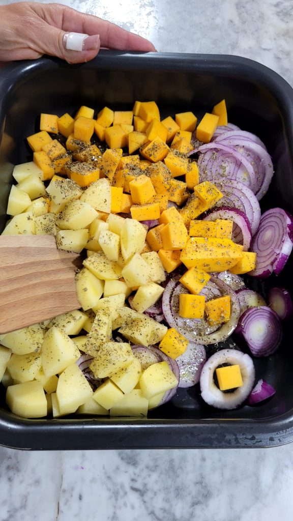 Transfira tudo para uma assadeira antiaderente, adicione um fio de azeite, sal, pimenta, manjerona e misture bem, com uma colher ou espátula de madeira