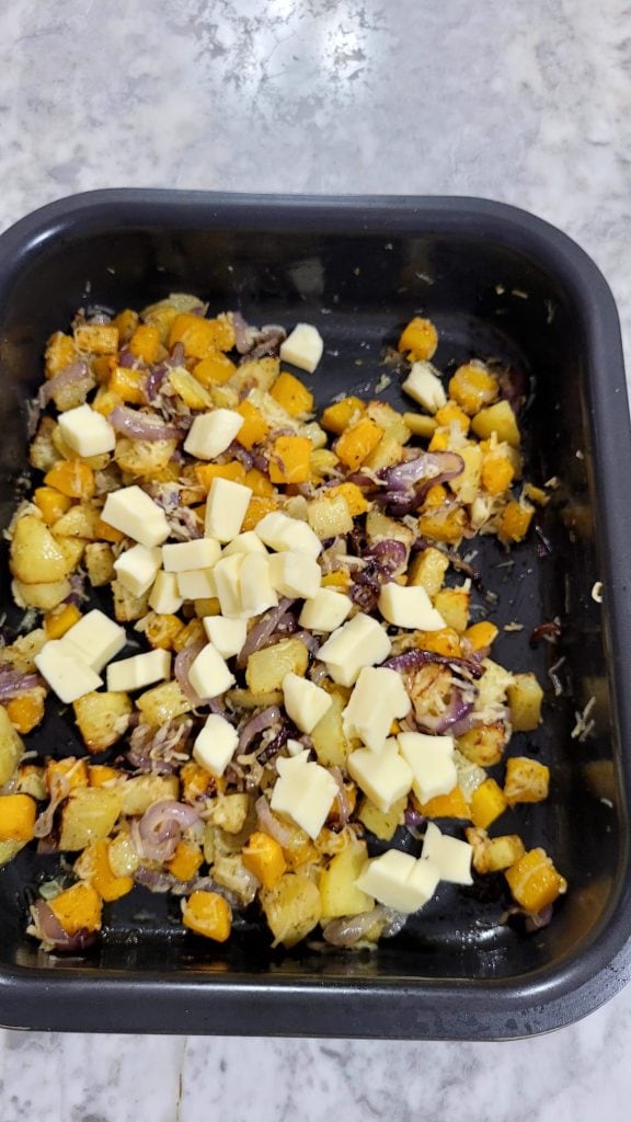 Comece com os vegetais: descasque e corte a abóbora em cubos, faça o mesmo com as batatas depois de lavá-las e secá-las. Descasque as cebolas de Tropea e corte-as em fatias não muito finas