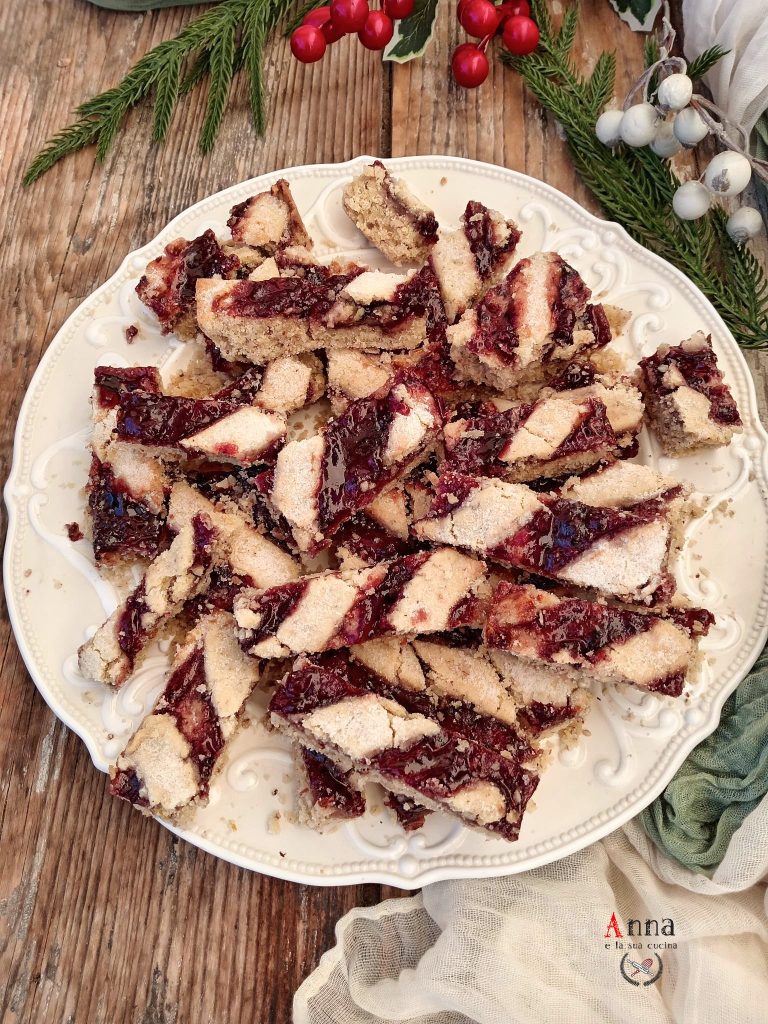 Os biscoitos de torta com massa de amêndoas, avelãs e geleia de frutas vermelhas são deliciosas tiras crocantes e perfumadas, perfeitas para qualquer ocasião, desde o café da manhã, lanche ou sobremesa, são muito bons e macios que derretem na boca.