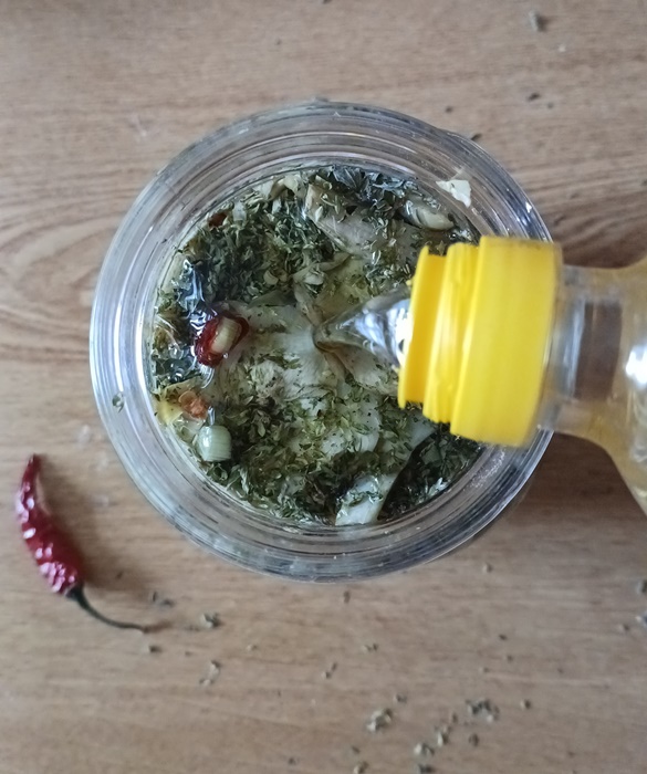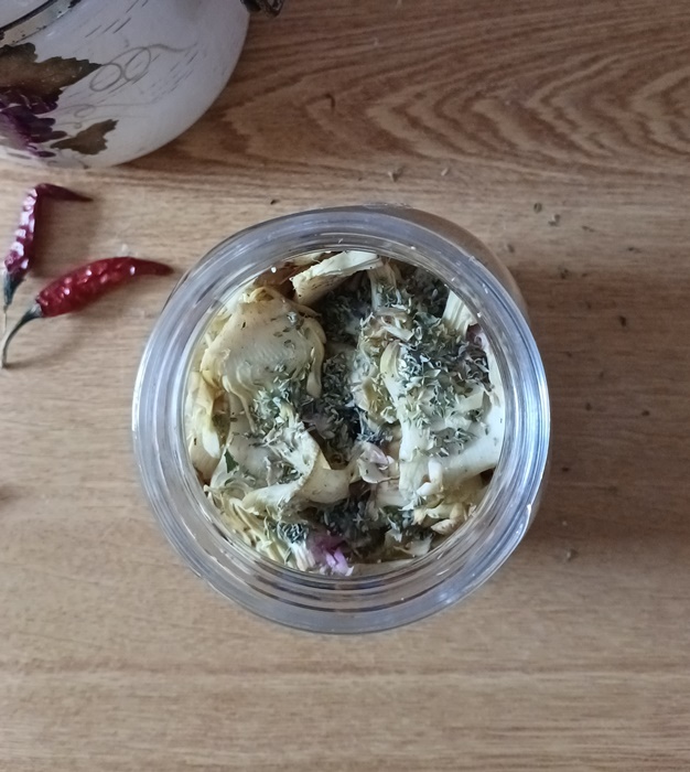 Passado o tempo de descanso, pegamos os potes esterilizados e colocamos um pouco de orégano dentro, depois começamos a colocar as alcachofras.
