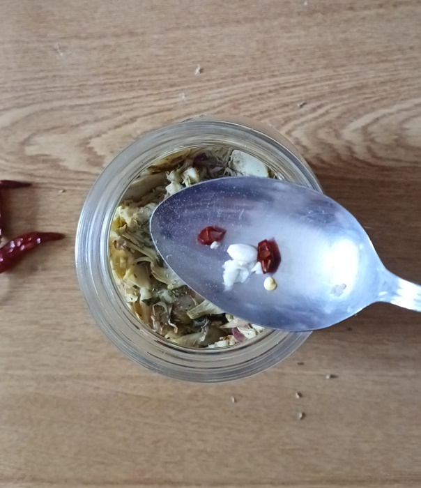 Continue em camadas como antes. Alcachofras, orégano, pressione bem, alho e pimenta até chegar a 3 cm da borda do pote (como na foto).