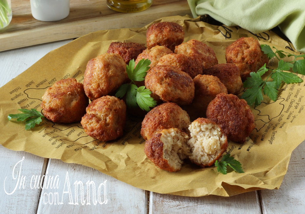 Adicione a carne de frango triturada ao pão, o queijo ralado (eu, como minha avó fazia, misturo pecorino e parmesão ralados, você pode usar também só um tipo ou queijo grana ralado), a salsinha e o alho picado, os ovos, ajuste o sal e adicione uma pitada de pimenta a gosto. Misture bem todos os ingredientes com as mãos até obter uma massa bem homogênea; se necessário, adicione outro ovo. A mistura deve ser compacta, mas macia.