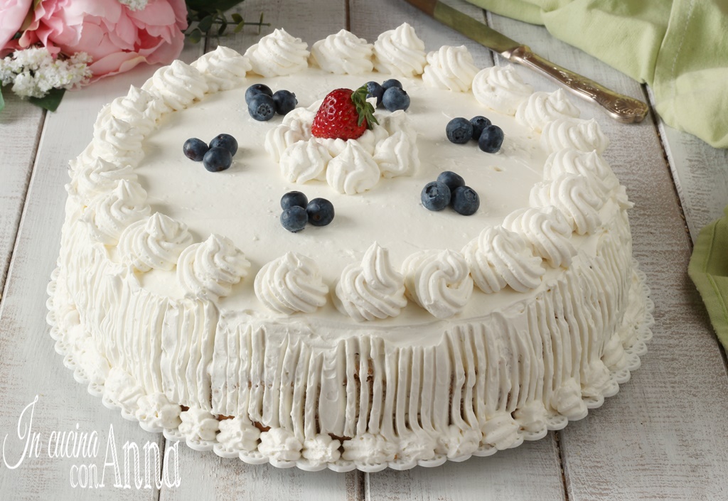 Retire o bolo da geladeira e cubra uniformemente com o chantilly, cobrindo também as bordas com a ajuda de uma espátula.