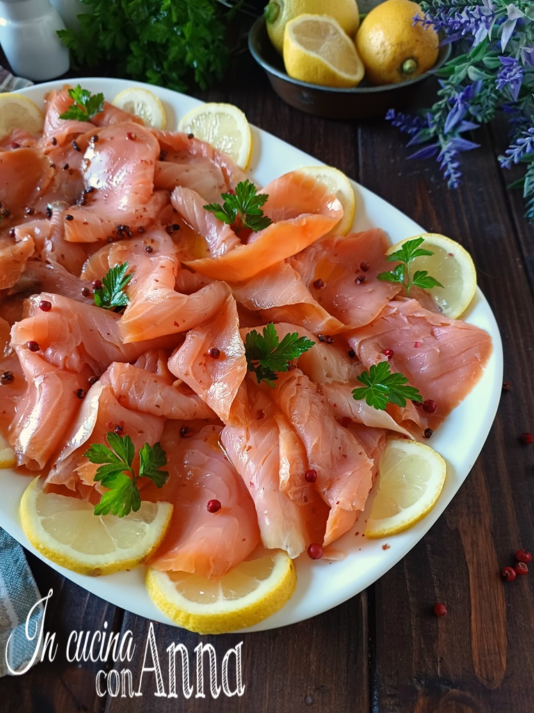 O carpaccio de salmão é uma entrada (ou prato principal, basta aumentar um pouco as doses) muito simples de preparar, rápido e extremamente saboroso. O salmão é marinado com óleo, limão e pimenta que lhe dá um sabor especial, para esta receita você pode usar tanto o salmão fresco quanto o defumado, uma única precaução, se usar salmão fresco deve ser previamente congelado a menos 18° por pelo menos 96 horas.