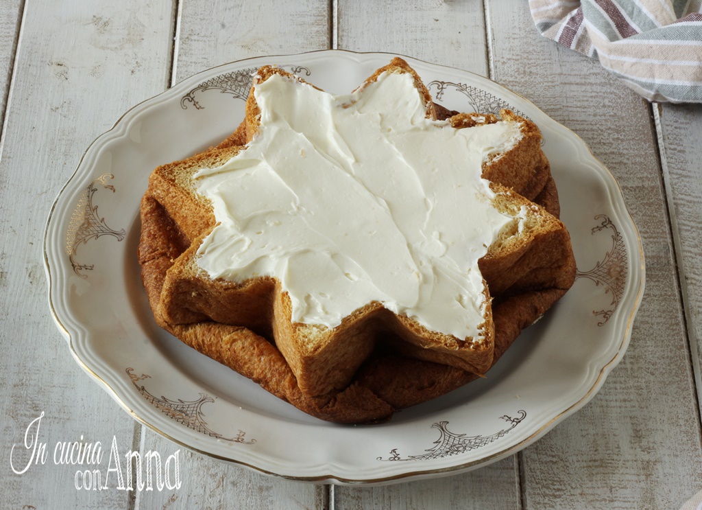Agora podemos proceder ao recheio da nossa estrela de pandoro, preenchendo a parte que esvaziamos com o creme de mascarpone, nivele bem com uma espátula (como na foto).