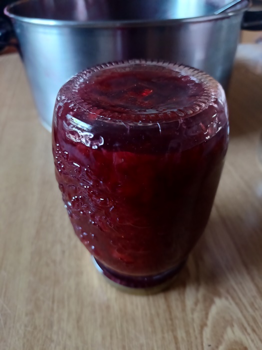 • Despeje a geleia quente em potes quentes recém-esterilizados e escorridos na hora (eu uso um funil para conservas).