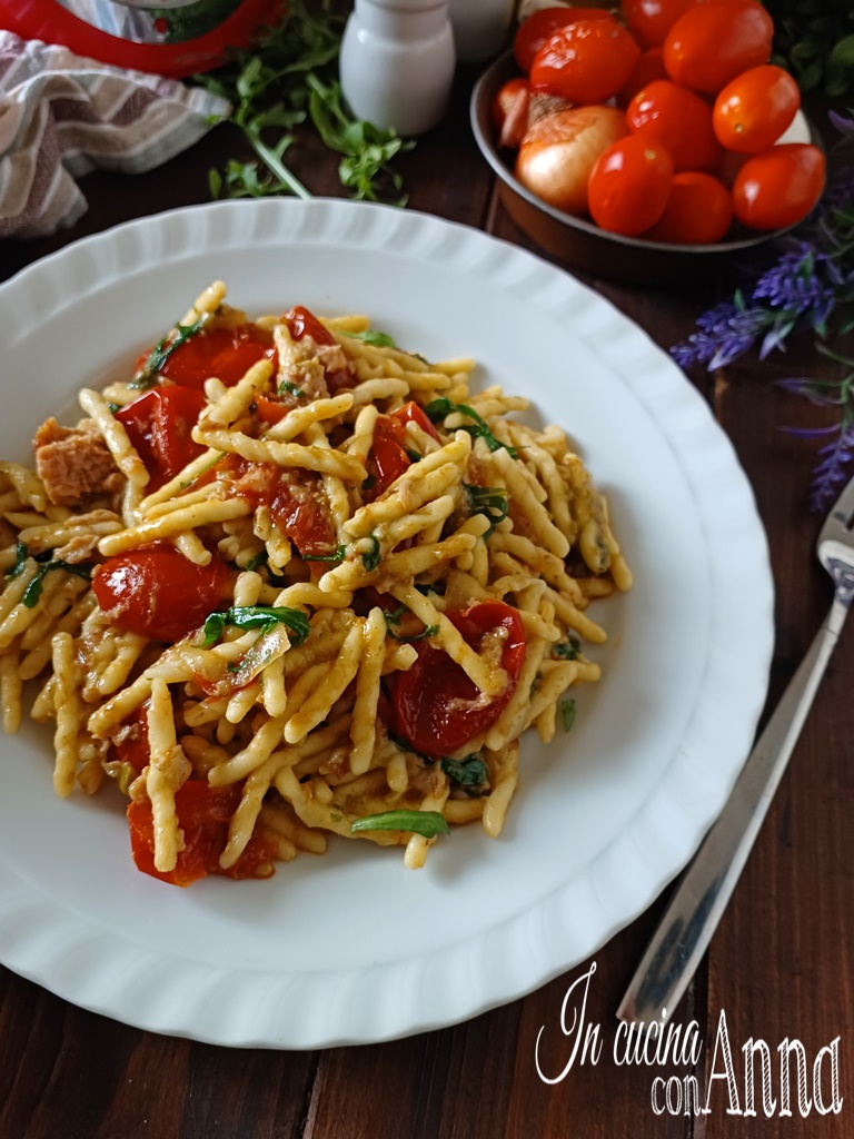 Adicione a rúcula restante picada aos tomatinhos que já estão cozidos e apague o fogo, adicione também uma pitada de pimenta e o atum escorrido um pouco do óleo, adicione o pesto de rúcula preparado anteriormente, misture tudo (eu não adiciono sal porque já tem a ricota salgada, prove se a salinidade está ao seu gosto).