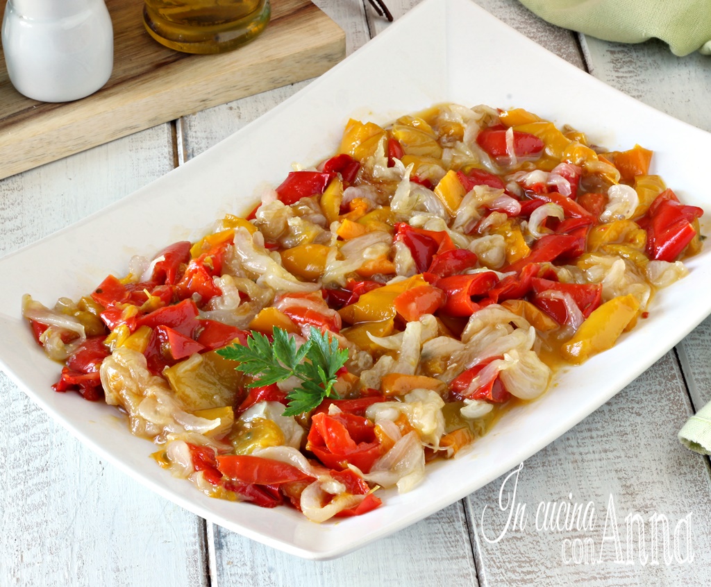 Lave bem os pimentões, seque-os e limpe-os removendo a tampa a que está preso o talo, todas as sementes internas e os filamentos brancos, corte-os em tiras (como eu fiz) ou em pedaços grandes de cerca de 2 cm.