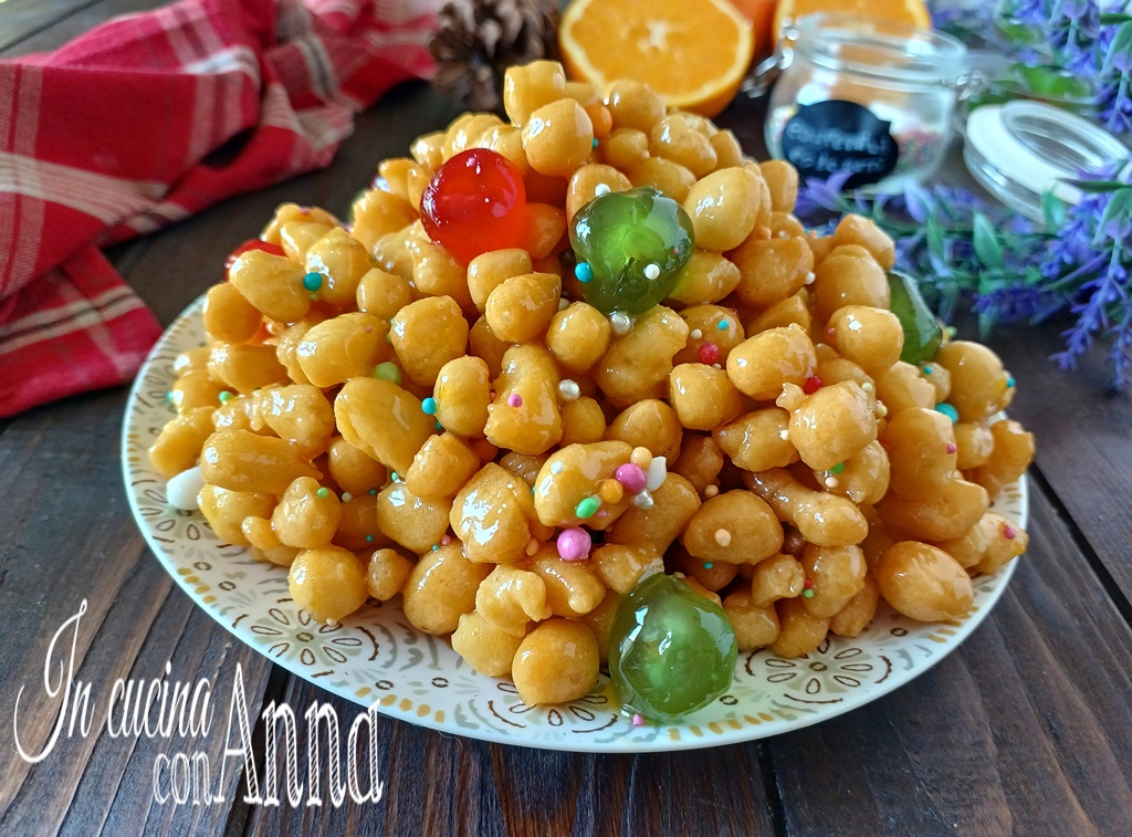 Os Purceddhruzzi salentini (purcidduzzi) são um doce típico da Apúlia no período natalino, na aparência se assemelham muito aos struffoli napolitanos de fato, muitas vezes se pensa que são a mesma coisa, mas a semelhança se limita à forma e à cobertura de mel, enquanto os ingredientes são diferentes, não contêm ovos, mas óleo e licor e são diferentes também na consistência, os purcidduzzi são mais macios, não muda, no entanto, a delícia, como os struffoli são deliciosos, absolutamente para provar 🙂