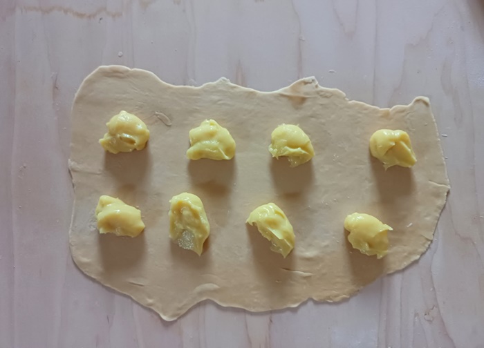 Com os dedos, pressione ao redor do recheio para selar a massa.